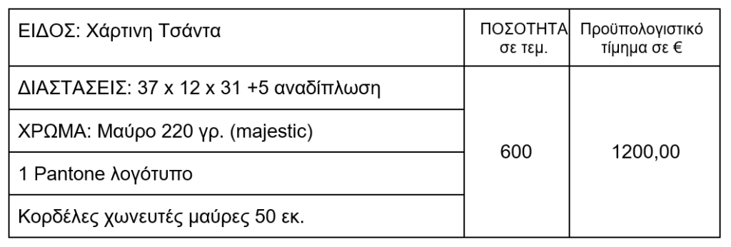 Η Ελληνική Αεροπορική Βιομηχανία Α.Ε. (ΕΑΒ Α.Ε.) ενδιαφέρεται για την Προμήθεια 600 Χάρτινων Τσαντών τα χαρακτηριστικά των οποίων περιγράφονται στον παρακάτω πίνακα.